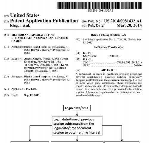 In 2012, I worked on a team of researchers at Brown University to develop products which aid in the physical rehabilitation of children with traumatic brain injuries. We based our work on research relating to video games and motivation as well as research related to rehabilitation, and designed and tested devices which act as video game controllers, allowing patients to complete their repetitive rehabilitation work while having fun. My work included building functioning prototype controllers to prove that rehabilitation motions can be utilized effectively as inputs for video games, as well as writing the initial version of the patent which we applied for, #20140081432.