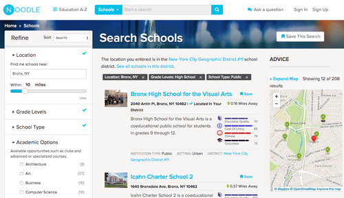 The final search product allows students and parents discover the most relevant of the nearly 500 high schools in New York City. The search was a significant upgrade of the preexisting Noodle School Search due to an increase of data as well as specialized search criteria which are specific to schools in New York City. Each school also received an individual profile, which contained school specific content and information in order to help people make decisions about what schools to apply and go to.